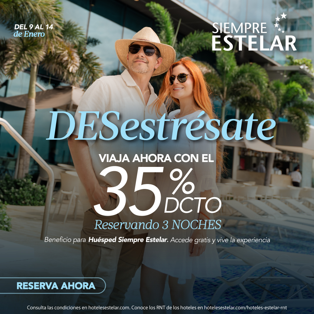 Hoteles Estelar S.A, ofrece el 35% de descuento sobre la tarifa base con desayuno incluido, para reservas realizadas entre el 9 de enero 2026 al 14 de enero 2026 de 2025 fechas de alojamiento del 9 de enero 2026 al 20 de diciembre de 2026, en habitación Junior Suite, Suite o Estándar (según disponibilidad de cada hotel). La presente campaña aplica únicamente para reservas mínimas de (3) tres noches consecutivas y máximo seis (6) noches consecutivas de estadía. El descuento ya se encuentra aplicado al momento de acceder a la campaña, estableciendo la tarifa base como el valor tachado. Al momento de realizar la reservar el cliente autoriza que el valor total de la reserva será debitado automáticamente de la tarjeta de crédito y/o débito que registre.