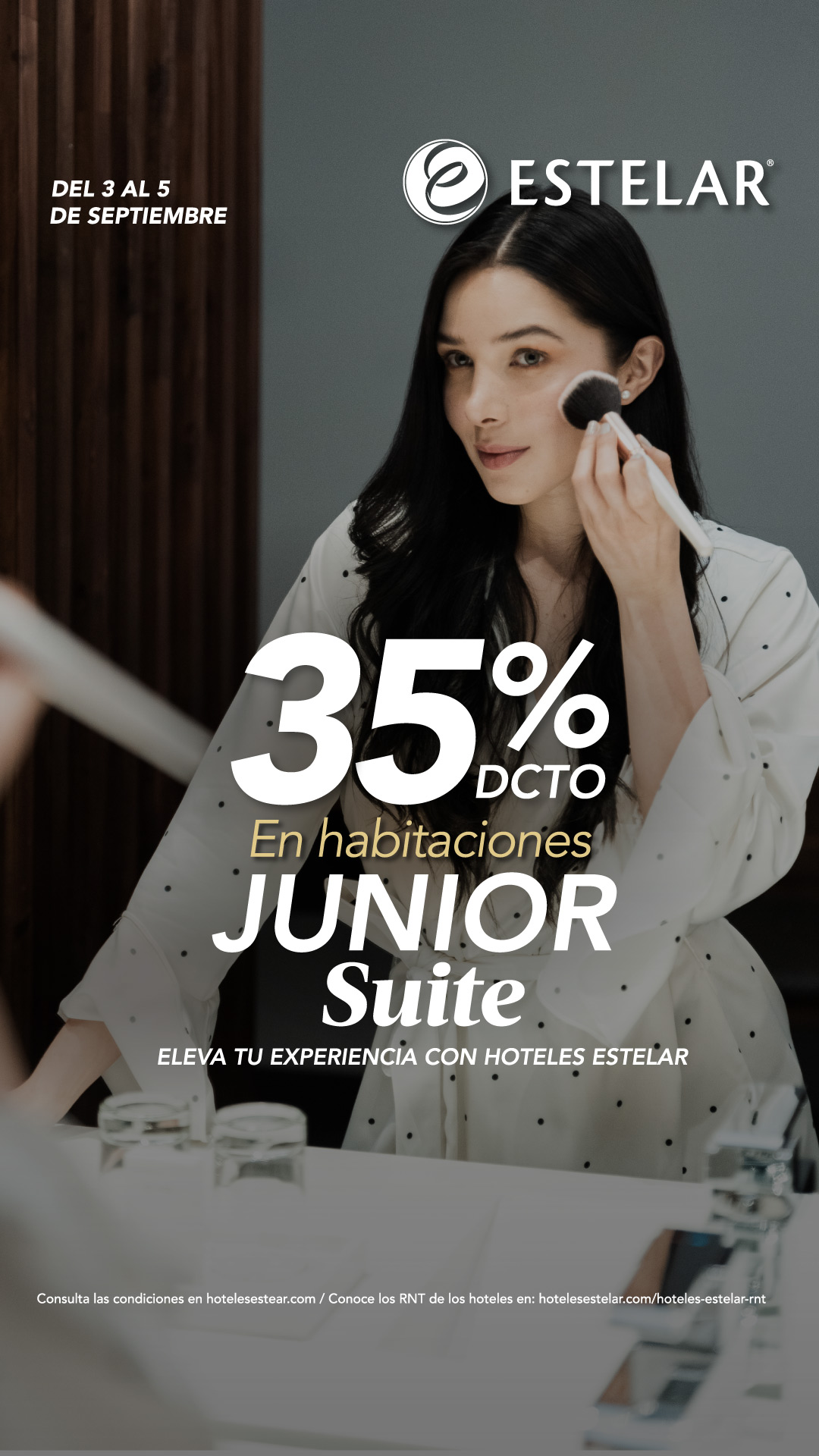 Descuento del 35% sobre la tarifa base con desayuno incluido para una (1) o dos (2) personas en habitación Junior Suite, acceso a internet y zonas húmedas (si el hotel cuenta con ellas, consúltelo en www.hotelesestelar.com). En Estelar Cartagena de Indias, Intercontinental Cali, Estelar Parque de la 93, Estelar Blue, Estelar La Torre Suites, Estelar Milla de Oro, Estelar La Fontana, Estelar En Alto Prado. Tarifa válida para reservas realizadas entre el 3 al 5 de septiembre, con fechas de alojamiento desde el 3 de septiembre al 20 de diciembre de 2025. Promoción disponible también para afiliados de la Caja de Compensación Compensar y la alianza Estelar-Compensar (Conforme a los términos y condiciones de la alianza), los cuales pueden reservar por medio de la página web alianzaestelarcompensar.com. Tarifa incluye IVA del 19%. Incluye el impuesto al consumo (Impoconsumo) en alimentos y bebidas. Tarifa no flexible: Esta tarifa no permite modificaciones ni cancelaciones de su reserva. Tarifa no reembolsable, salvo causales legales, al reservar usted autoriza que el valor total del alojamiento sin IVA sea debitado de la tarjeta que usted ingrese. El descuento se verá reflejado al momento de realizar la reserva. Al momento de hacer la reserva vía web la tarifa base se mostrará tachada y junto a ella podrá verse la tarifa final (total) con la aplicación efectiva del treinta y cinco por ciento de descuento (35%). Tarifa válida para todos los días de la semana, no acumulable con otras promociones o descuentos. No aplica para negociaciones corporativas ni para reservas superiores a nueve (9) habitaciones.